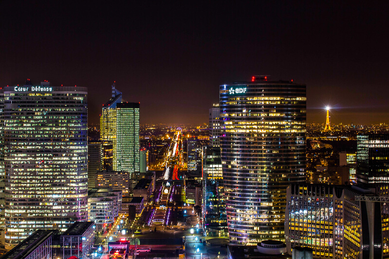 At night, the distant lights of the Paris skyline along with the Arc de Triomphe and the Eiffel Tower are clearly visible from the top of the Arche, despite being upstaged by the glittering skyscrapers.